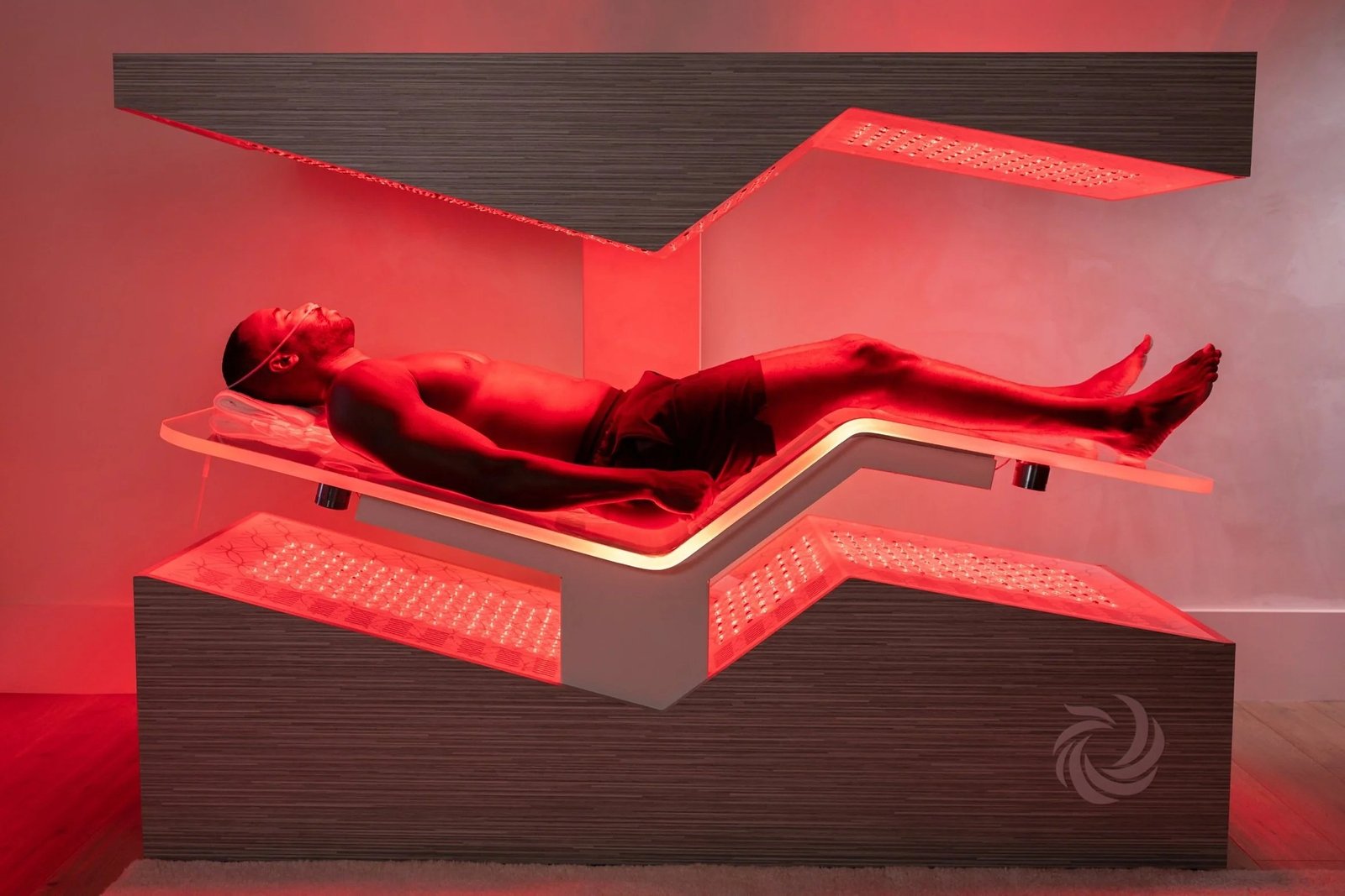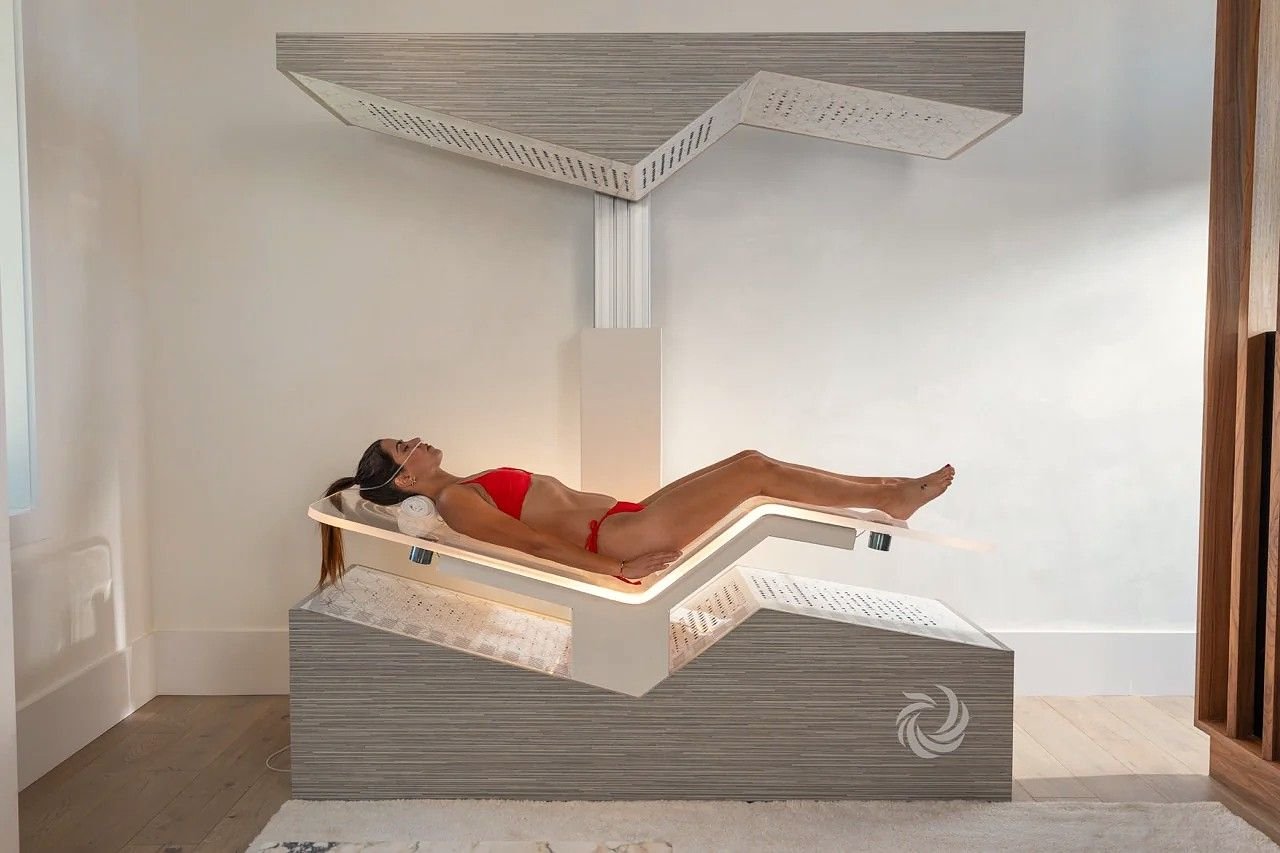 Longevity pods turn at-home care into a calming immersive treatment: salt, red light, oxygen, sound, and scent combined into one guided session.