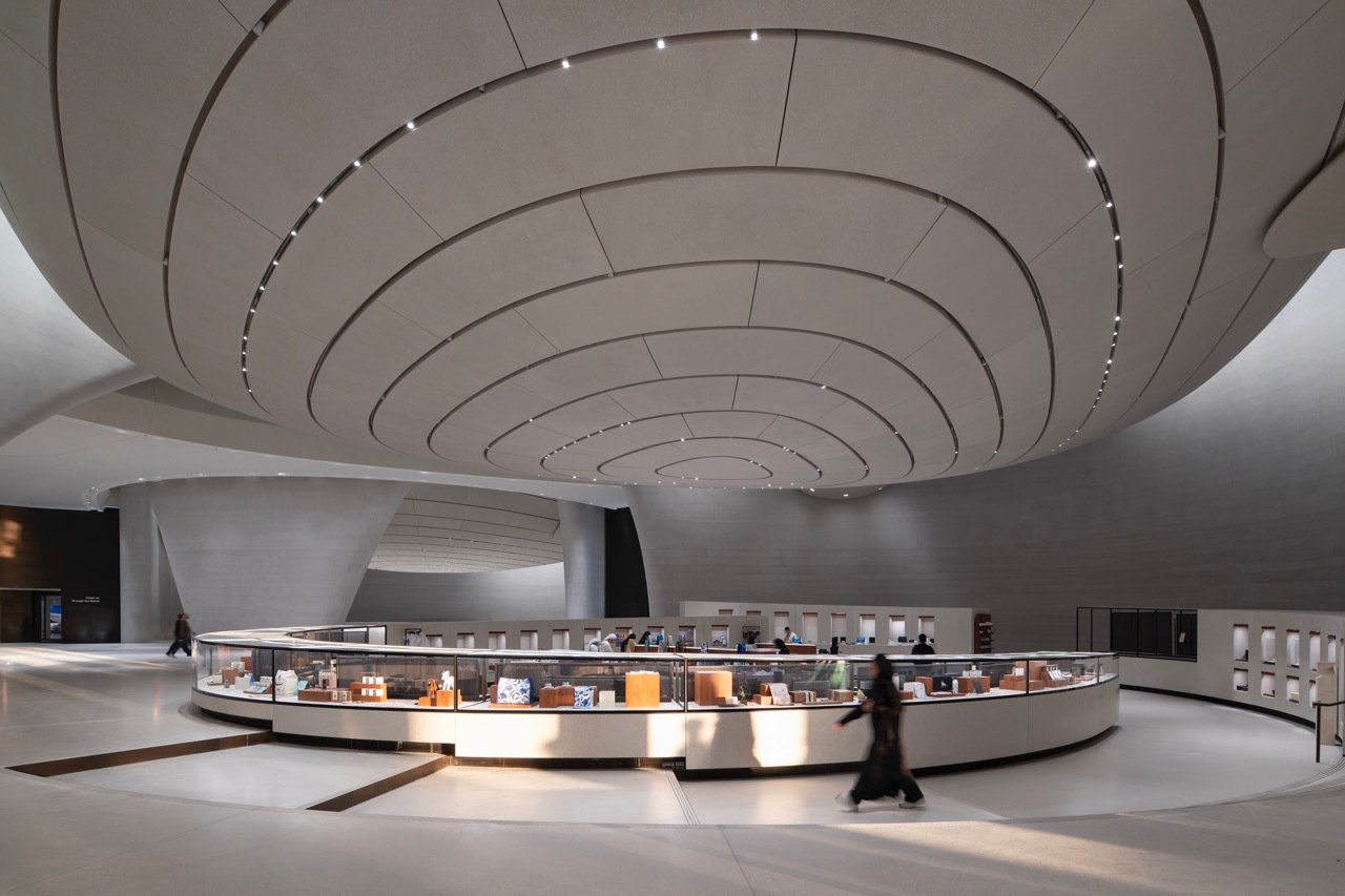 The first impression starts before you enter. The building is the message. Foster + Partners shaped five soaring structures inspired by a falcon’s wing in flight, and they also function as part of the building’s environmental strategy, drawing hot air up and out while cooler air feeds the interior through low-level systems. The museum’s own materials explain the reference to barjeel wind-tower principles, so the symbolism and the physics speak the same language.